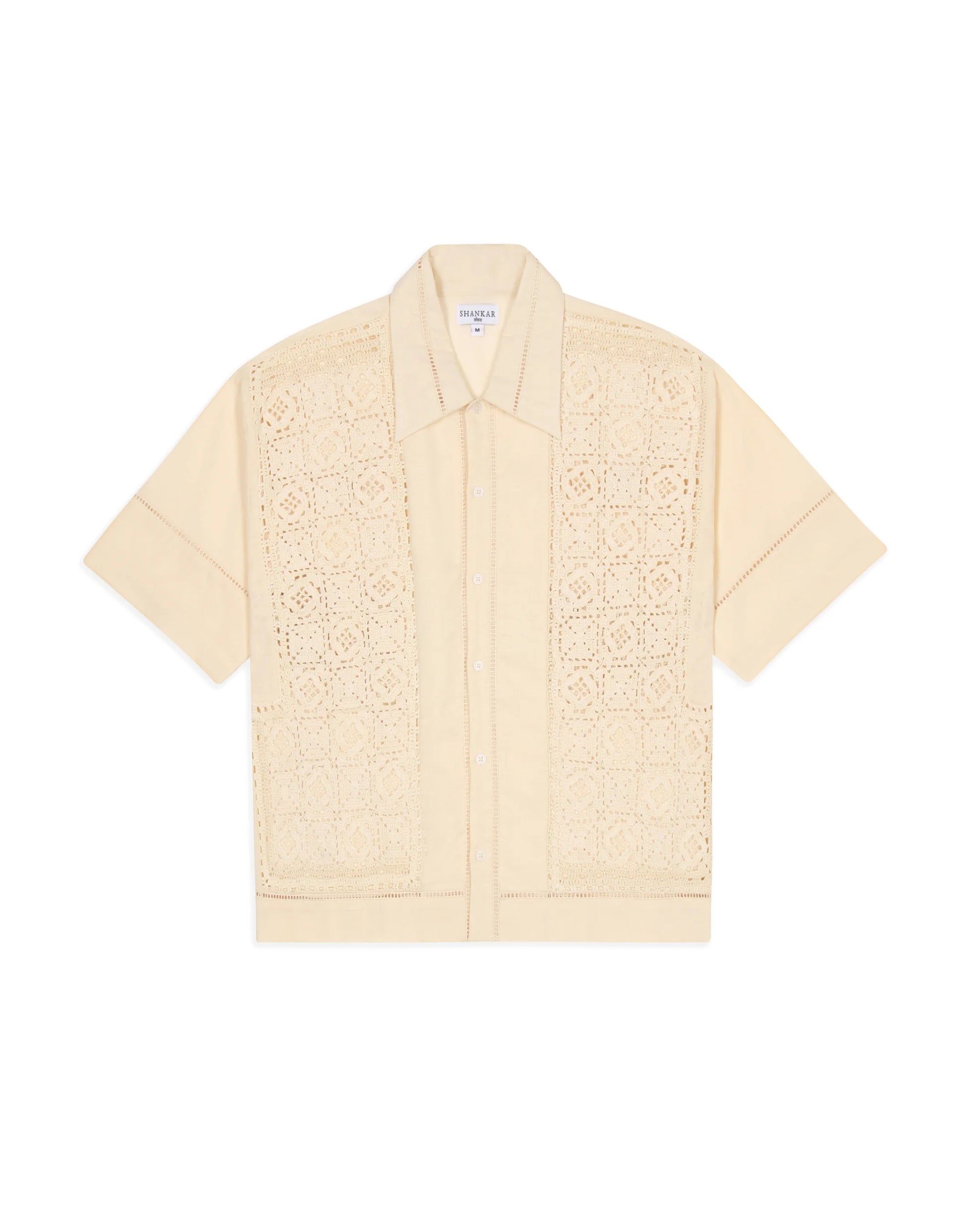 A canvas of elegance and heritage. A hand-painted Mughal motif, meticulously rendered on fine fabric. Its oversized Cuban collar, cut with retro sensibility, lends vintage charm to the relaxed silhouette. The fluid drape enhances its intricate artistry, making it a true statement of craftsmanship. Mughal-inspired opulence meets contemporary tailoring, transforming it into more than just a shirt.