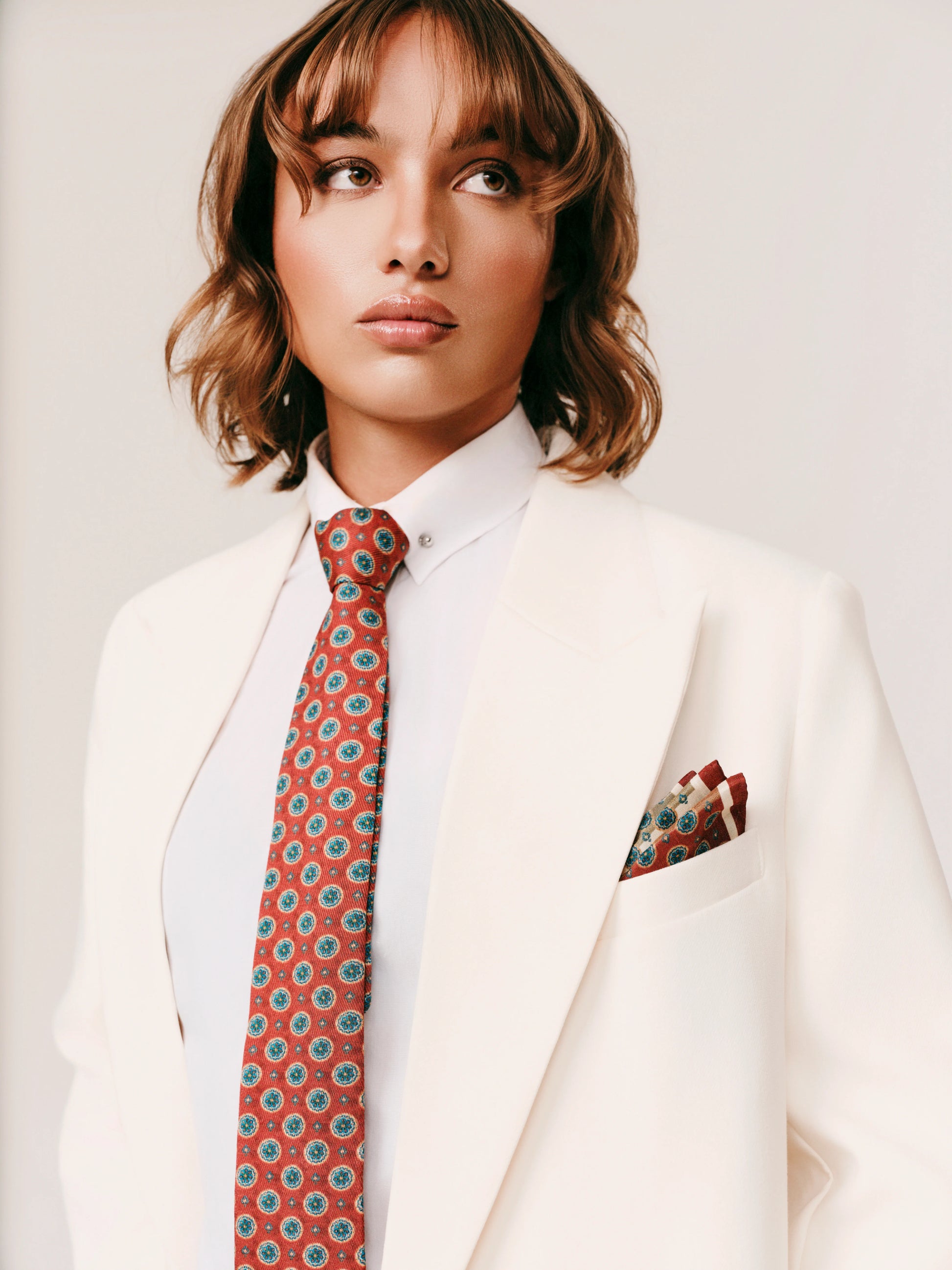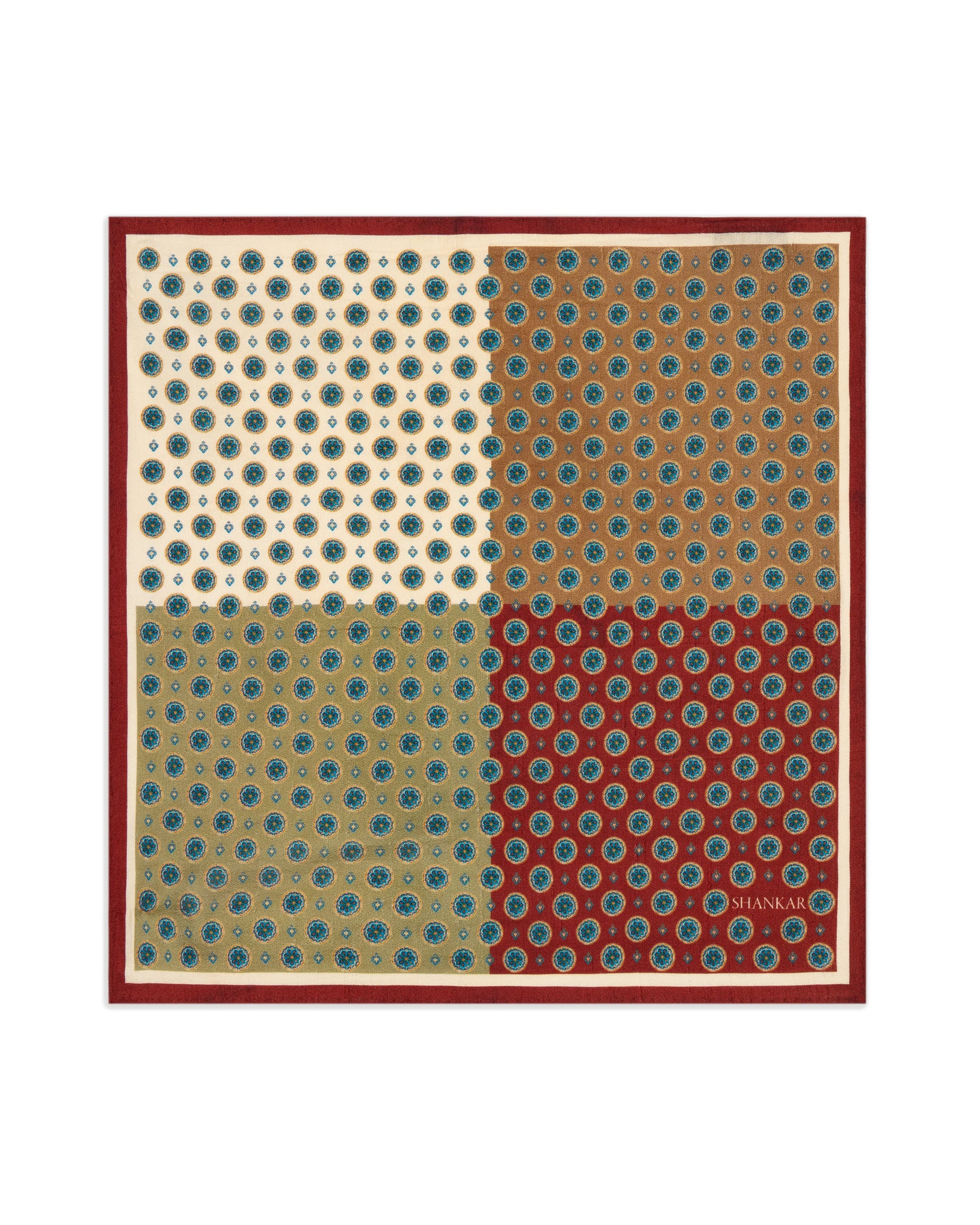 Crafted in pure silk, this pocket square features a distinctive four-colour grid adorned with a Mughal-inspired motif, originally hand-painted. A piece that infuses timeless tailoring with refined artistry.